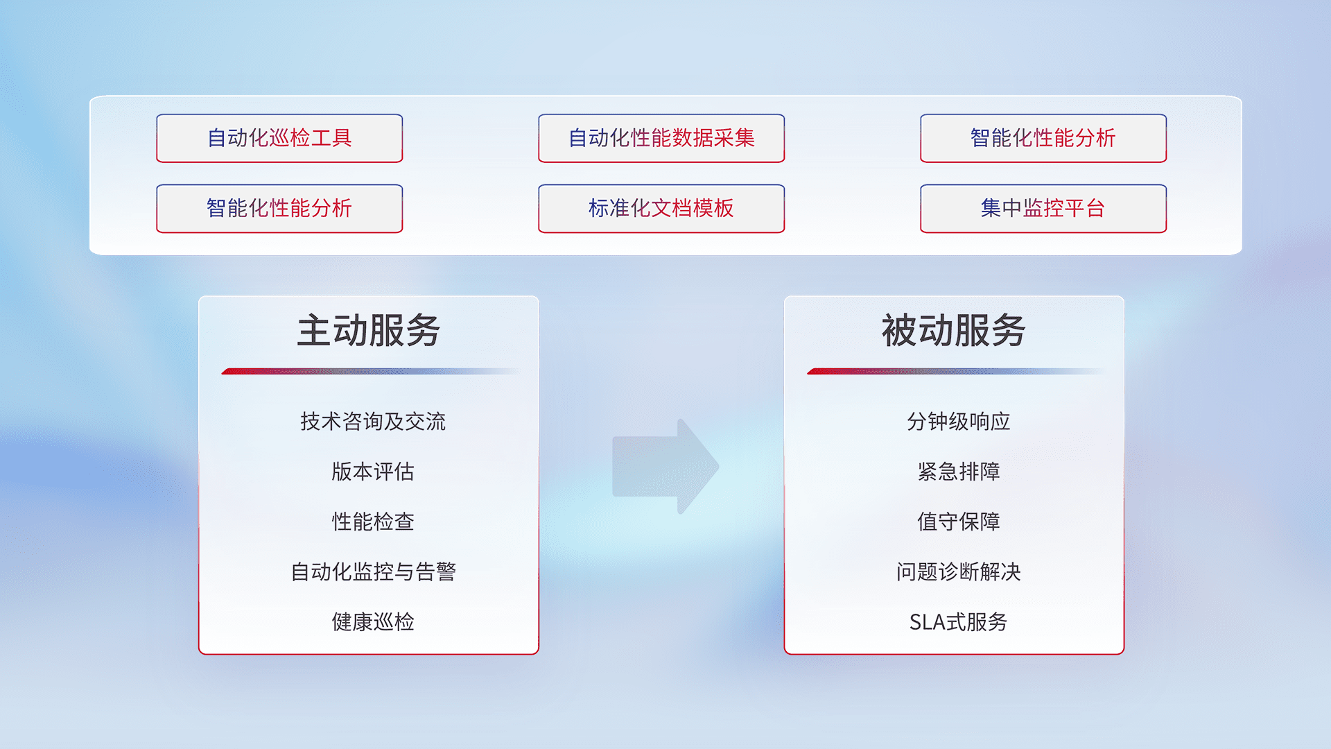 智能化工具和标准化文档,,,,保障服务质量,,,,提供主动服务(包含技术咨询、、、版本评估、、性能检查、、自动化监控与告警、、、、健康巡检)和被动服务包含(分钟级响应、、紧急排障、、、、值守保障、、、问题诊断解决、、、SLA服务)。。